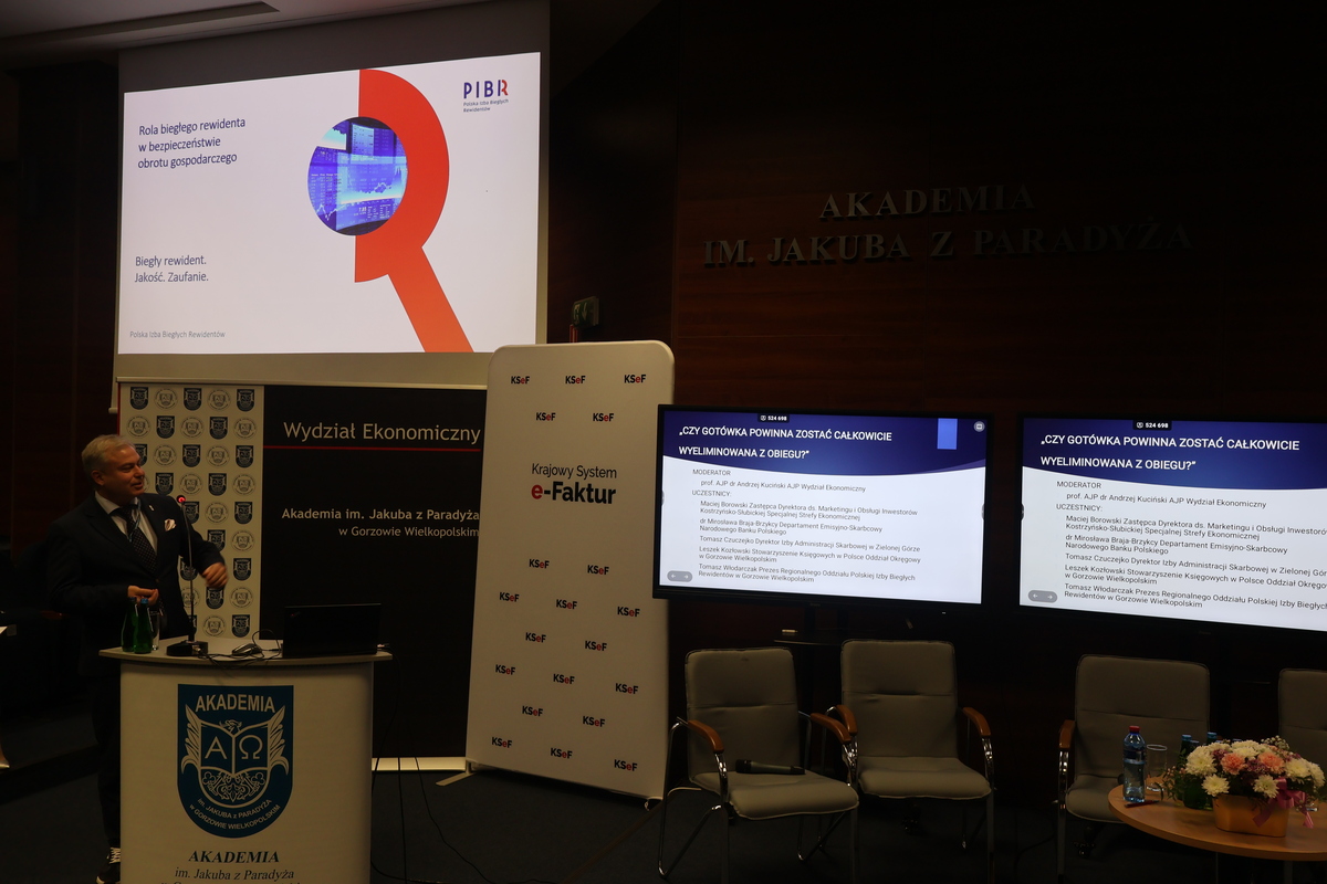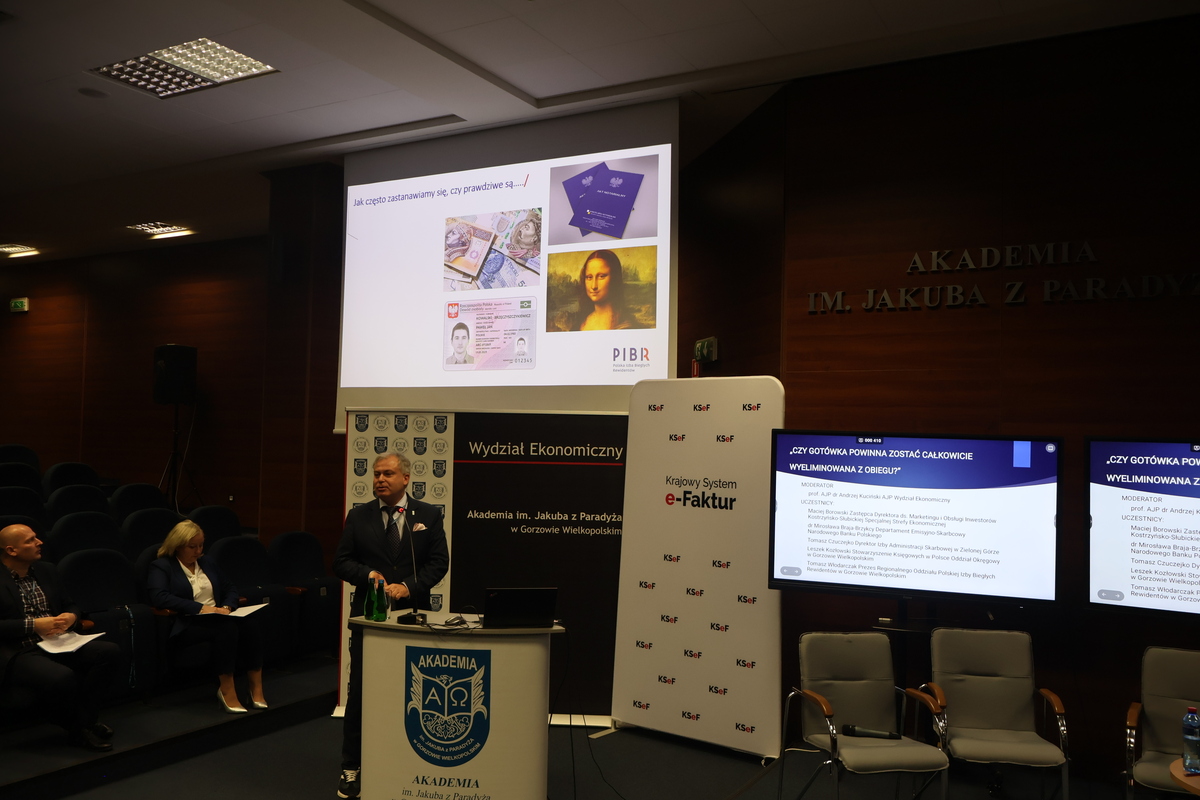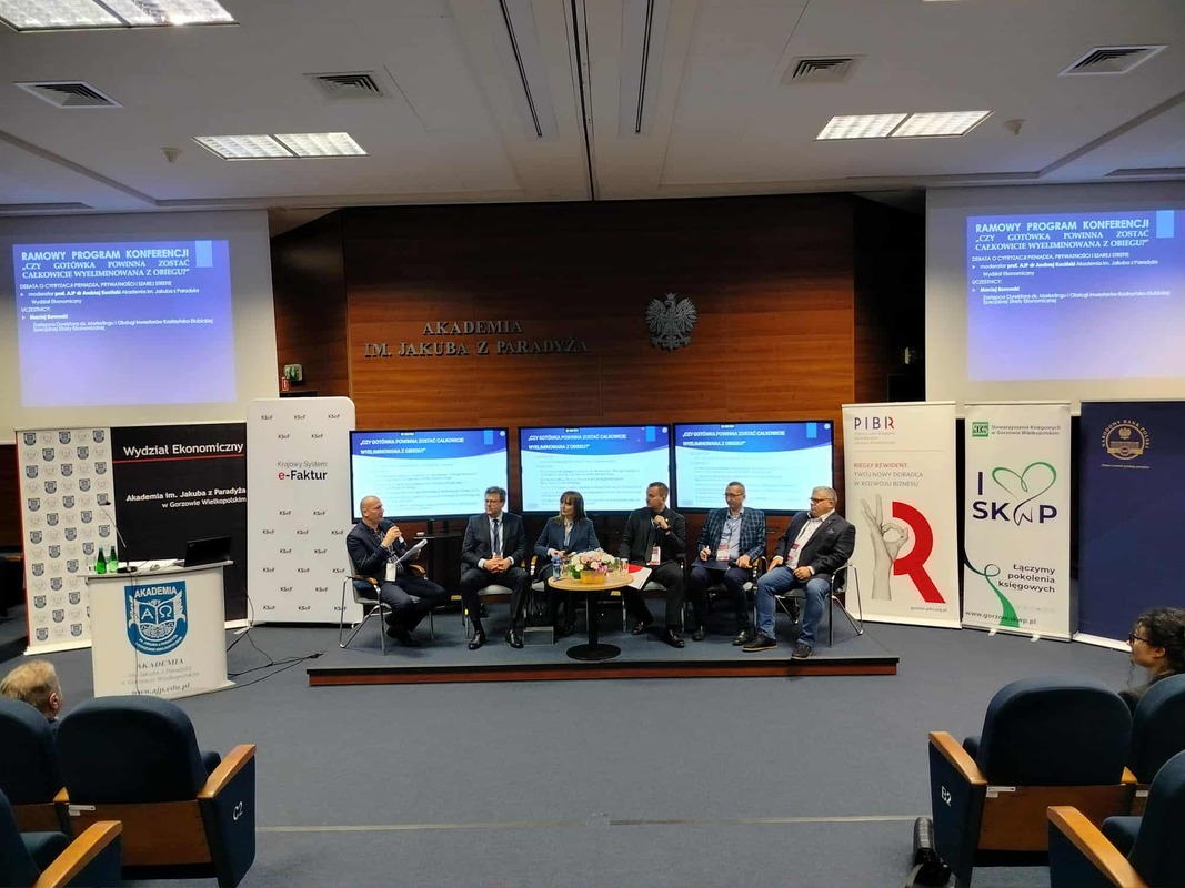 W drugiej części konferencji prof. AJP dr Andrzej Kuciński zaprosił do debaty o tematyce „CZY GOTÓWKA POWINNA ZOSTAĆ CAŁKOWICIE WYELIMINOWANA Z OBIEGU?”